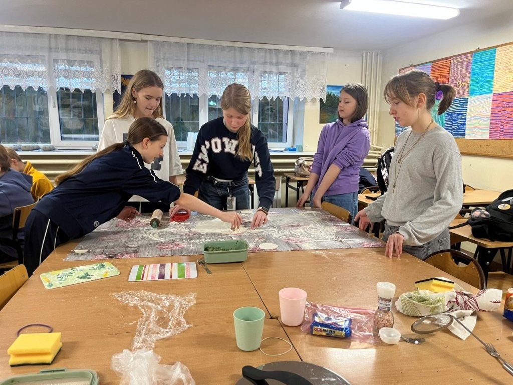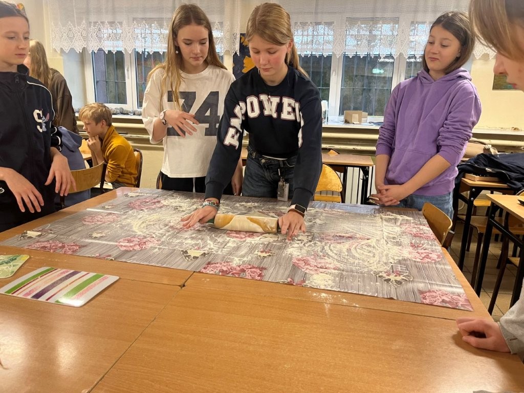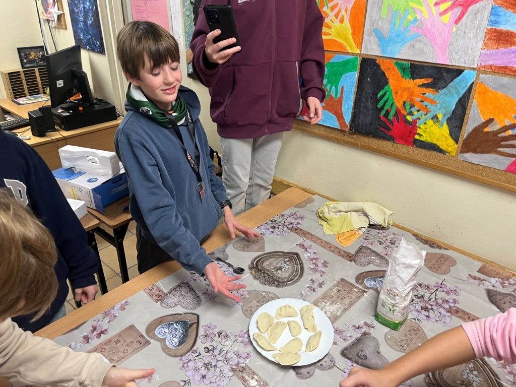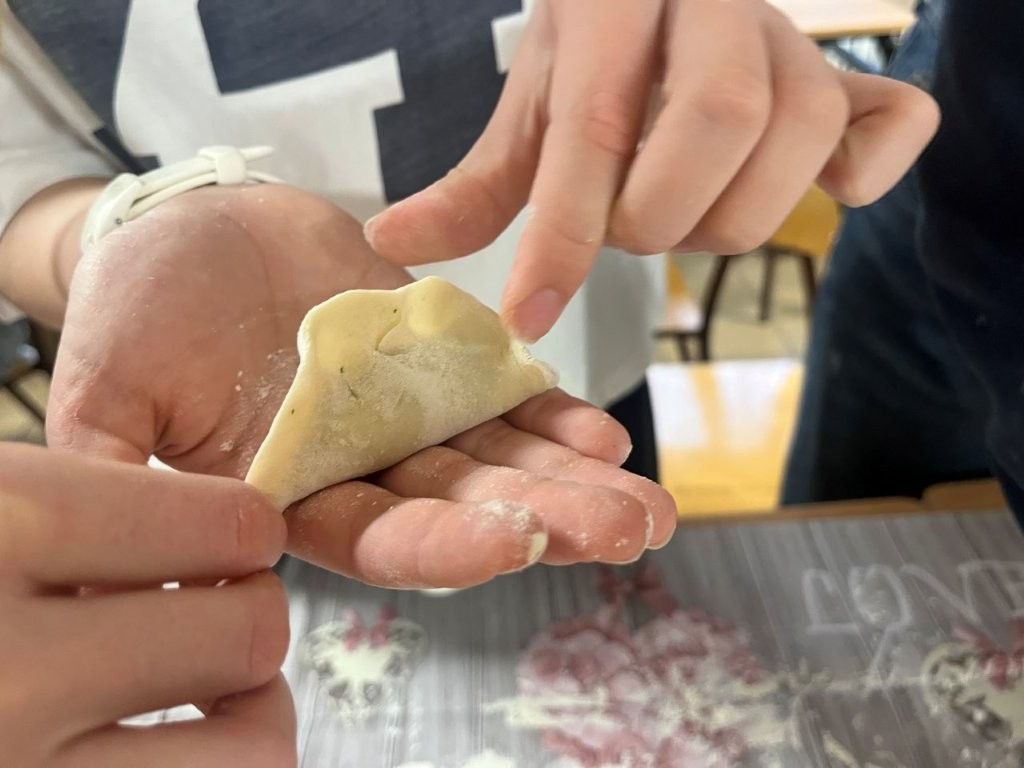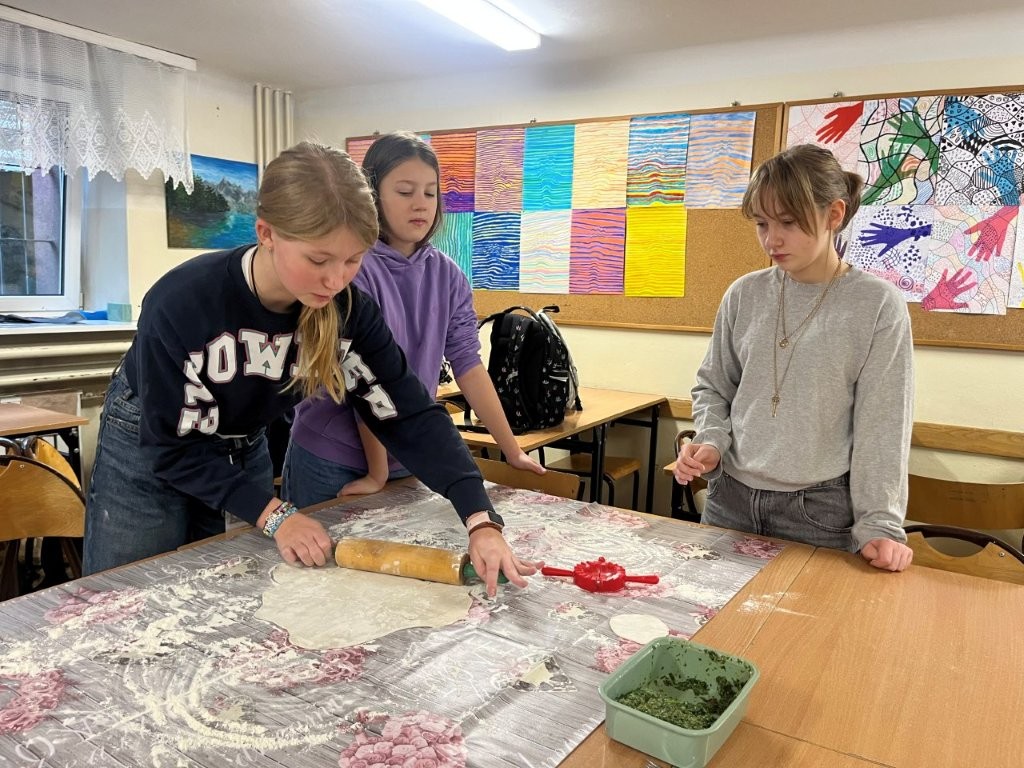 Uczniowie biorący udział w międzynarodowym projekcie Global Scholars spędzili dzisiejszy dzień bardzo pracowicie – wspólnie przygotowaliśmy pierogi z mięsem oraz pierogi ze szpinakiem. Była to doskonała okazja, aby zaprezentować naszym zagranicznym kolegom jedne z najbardziej znanych i lubianych polskich dań oraz opowiedzieć o ich wartościach odżywczych.