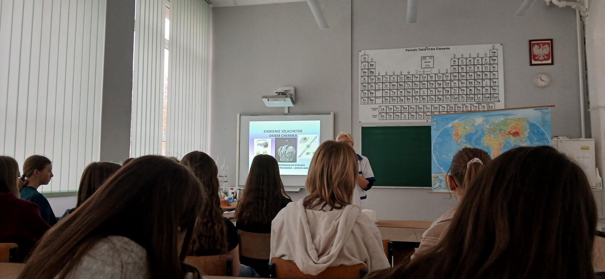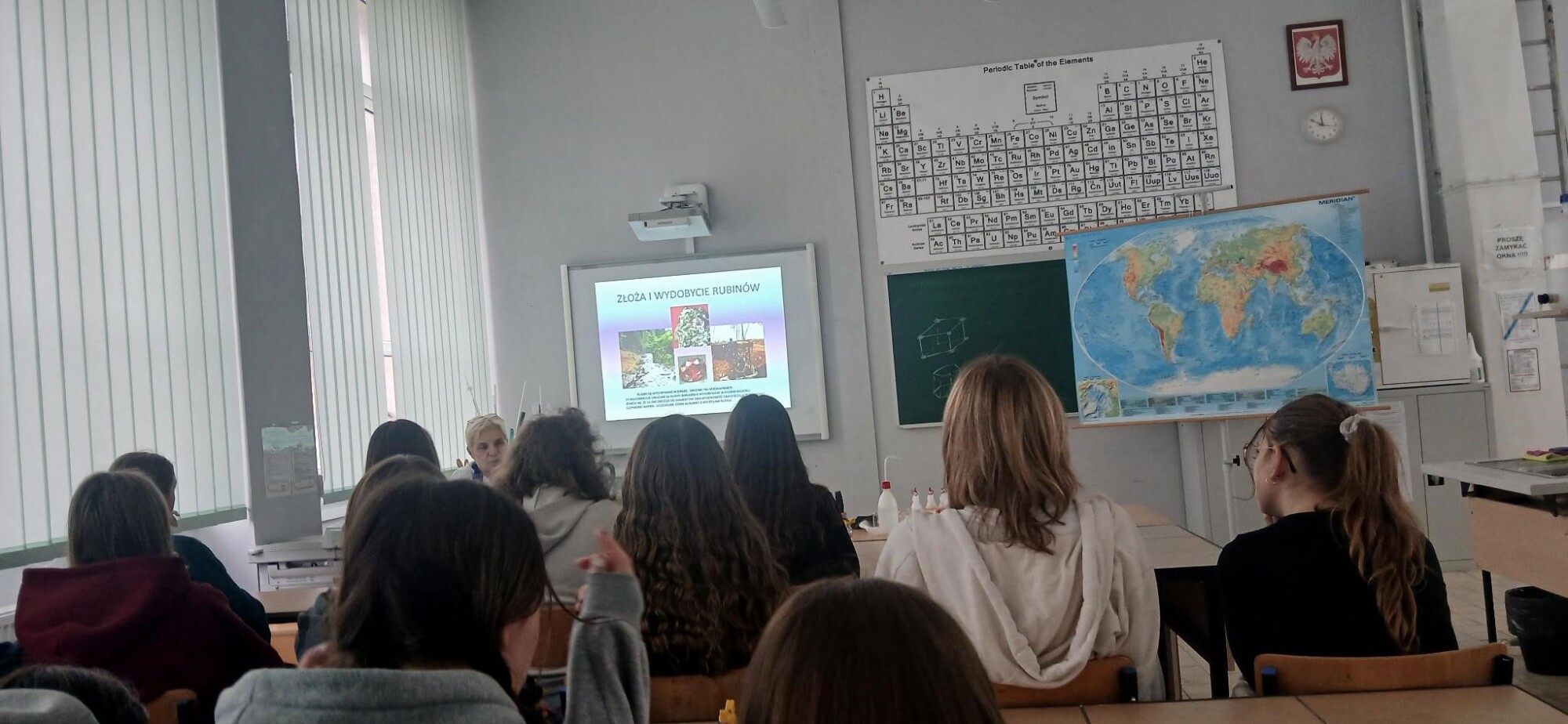 Klasa 8 A uczestniczyła w lekcji organizowanej przez Zespół Szkól nr 21 w Warszawie - ,,Minerały i kamienie szlachetne okiem chemika". Podczas wykładu połączonego z pokazem doświadczeń uczniowie dowiedzieli się co to są minerały, jakie wyróżniamy kamienie szlachetne. Ponad to została omówiona budowa poszczególnych kamieni szlachetnych, ich wydobycie oraz sposoby obróbki. Na zakończenie wykładu, w ramach ciekawostki, Pani Prelegentka omówiła proces powstawania pereł.