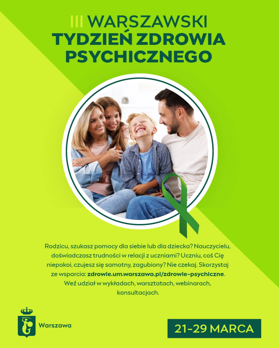Warszawski Tydzień Zdrowia Psychicznego to inicjatywa, która łączy edukację z realnym działaniem na rzecz zdrowia psychicznego mieszkańców i mieszkanek Warszawy. Tworzy przestrzeń do spotkania z ekspertami oraz dostęp do sprawdzonych informacji z zakresu zdrowia psychicznego. Uczestnictwo w spotkaniach pozwoli poszerzyć wiedzę i umiejętności, które są potrzebne, żeby skutecznie reagować na trudności emocjonalne dzieci, młodzieży, dorosłych. Program wszystkich warszawskich placówek znajdą Państwo na stronie Warszawski Tydzień Zdrowia Psychicznego - Zdrowie.