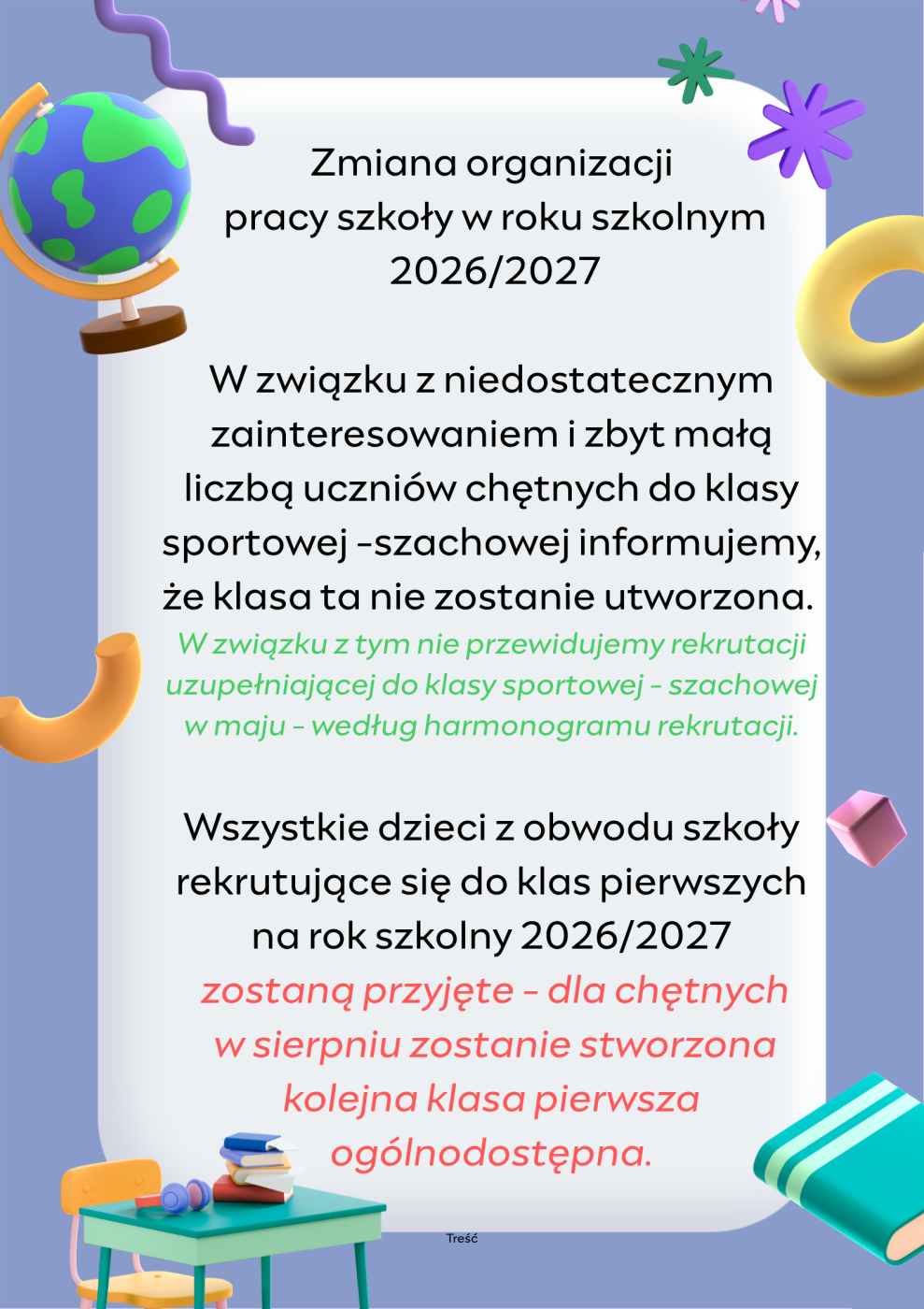 Zmiana organizacji pracy szkoły w roku szkolnym 2026/2027